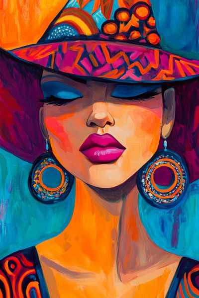 Über „Farbige Porträtdame mit Hut und Ohrringen“ von Poster Art Shop