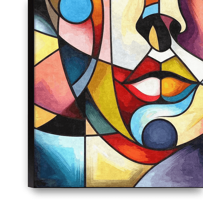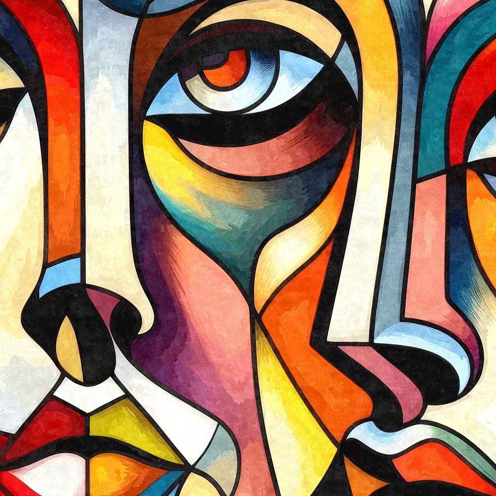 Zwei stilisierte Gesichter in kubistischer Manier – ein Spiel aus Geometrie, Farbe und Ausdruck. Die kräftigen Linien und leuchtenden Töne erzeugen eine dynamische Spannung zwischen Nähe und Individualität.