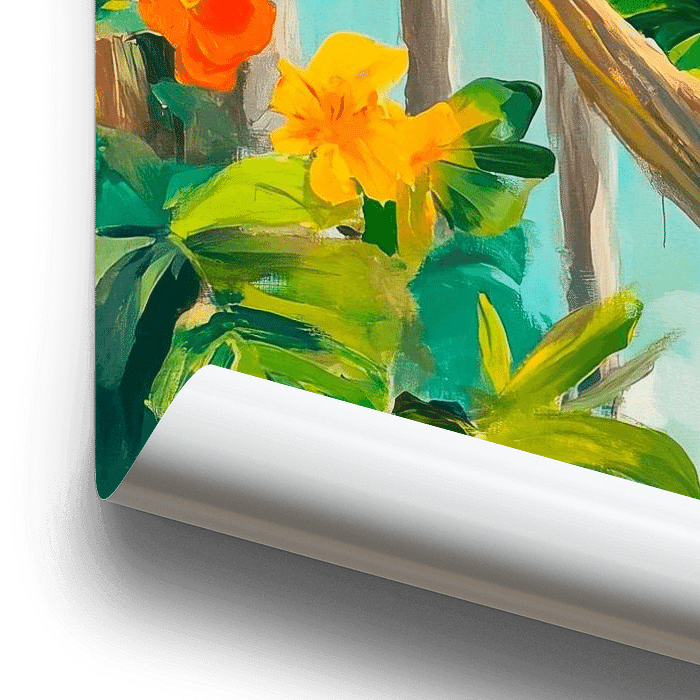 In einer tropischen Oase schwingt eine entspannte Faultiergestalt in einer luftigen Hängematte, umgeben von üppigem Grün und bunten Blumen. Mit einem fruchtigen Cocktail in der Hand genießt es die Ruhe des Lebens – verströmt ein Gefühl von Gelassenheit und sorgloser Freude. Ein wahres Paradies für Entschleunigung und Genuss!