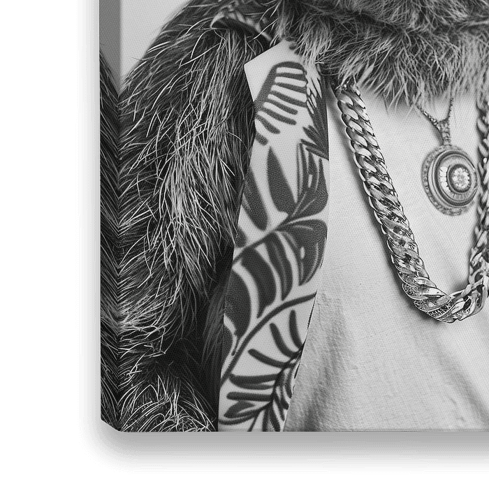 Ein schwarz-weißes Porträt eines Faultiers, bekleidet mit Hut und Sonnenbrille, das lässige Eleganz ausstrahlt. Ein perfektes Bild, das Stil und Tierliebe kombiniert.