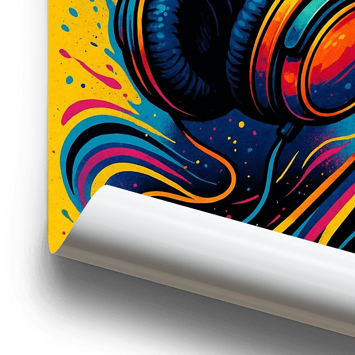 Dieses energiegeladene Poster bringt Musik nicht nur ins Ohr, sondern direkt ins Auge. Im Mittelpunkt steht ein Paar Kopfhörer, kunstvoll inszeniert in leuchtenden Farben und dynamischen Formen. Das kräftige Zusammenspiel von Gelb, Blau, Magenta und Orange erzeugt ein Gefühl von Rhythmus, Bewegung und pulsierender Energie – fast so, als…