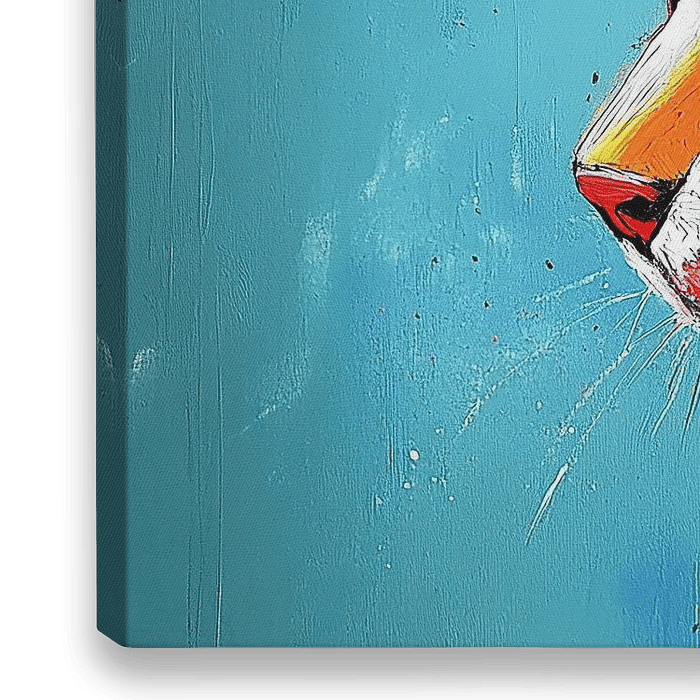 Katzenprisma - Dieses farbenfrohe Tiergemälde zeigt das Porträt einer Katze, ausgeführt in einem ausdrucksstarken, fast abstrakten Stil mit leuchtenden, spritzenden Farben, die in starkem Kontrast zu einem ruhigen türkisfarbenen Hintergrund stehen.