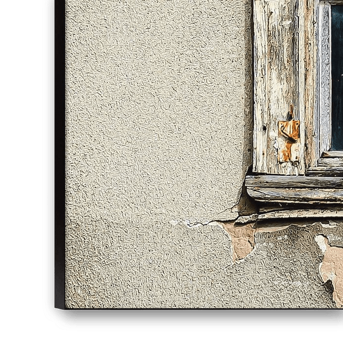Ein wartungsbedürftiges Fenster. Vorbei mit der Herrlichkeit. Das Fenster ist kaputt und der Putz blättert ab. Und das mögen wir doch, oder? Wabi sabi. Auf der Fensterbank stehen auch ein paar alte Vasen.