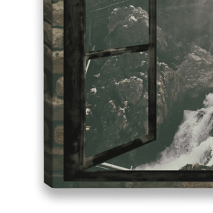 Blick zum Wasserfall, Fensterbild, Golling, Österreich, Wasser, Schönheit. Tourismus, Reisen, Natur, Landschaft, grün, Mauerwerk, Altes Fenster. Collage von altem Fenster in Braunau am Inn und Fotografie Gollinger Wasserfall