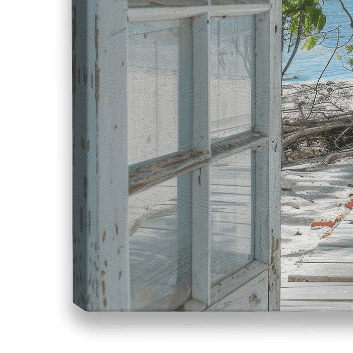 Bestelle dieses Landschafts-Wandbild Fensterblick auf tropischen Strand von Poster Art Shop als Reproduktion auf Leinwand, Alu-Dibond, als Poster, Fototapete oder Acrylglasbild.