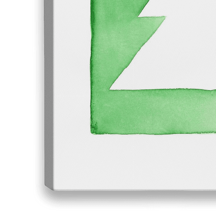 Das Aquarellgemälde zeigt eine minimalistische Komposition aus sich überlappenden geometrischen Formen in Rot-, Grün- und Gelbtönen. Ein weißer Tannenbaum ist prominent in der Mitte platziert und sorgt für eine ausgewogene harmonische Komposition.