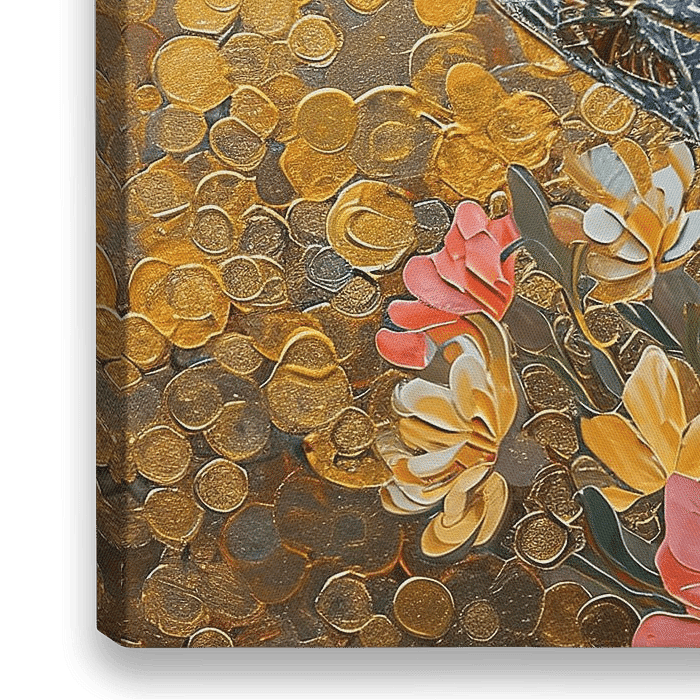 Fisch - Dieses dynamische Bild zeigt ein ausdrucksstarkes Porträt eines Fisches, das mit einer reichen Farbpalette vor einem goldenen Hintergrund wiedergegeben wird, der wunderschön mit dem Licht spielt. Die detaillierte Textur und der lebhafte Kontrast zwischen den kühlen Blautönen des Fisches und den warmen goldenen und orange-roten…