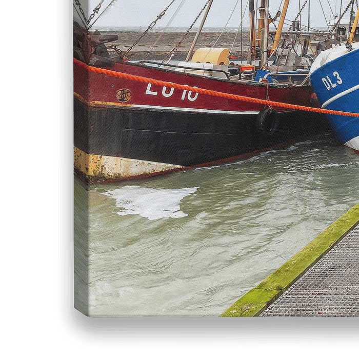 Fischkutter aus Doel (B) und Lauwersoog machen an einem stürmischen Sonntag im Frühjahr 2014 an einer Pier im Wattenmeerhafen von Lauwersoog fest.