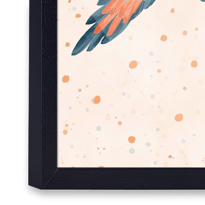 Illustrierter Papagei, der in den rosa Himmel fliegt, mit einem Regen aus festlichen Punkten darunter. Ideal für das Kinderzimmer oder die Kinderecke! Die sanften Farben machen dieses Poster auch für andere Räume geeignet.