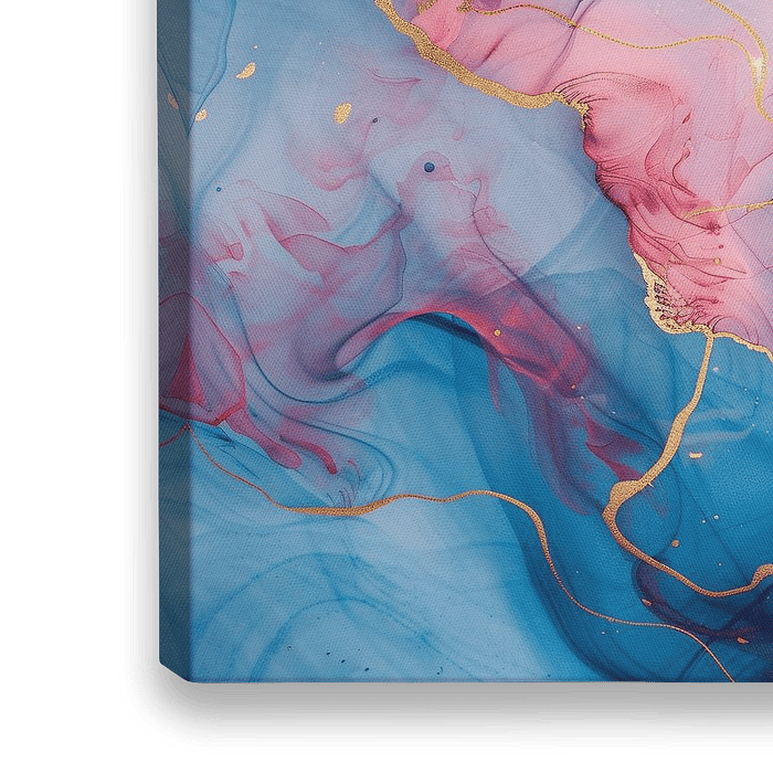 Dieses stilvolle Design bringt ein modernes Gefühl in jedes Interieur. Die fließenden abstrakten Formen in tiefen Blau- und zarten Rosatönen sind mit eleganten goldenen Linien verziert, die einen luxuriösen Touch verleihen. Es erinnert an eine Luftaufnahme eines mystischen Flussdeltas oder einen farbenfrohen Blick auf neblige…