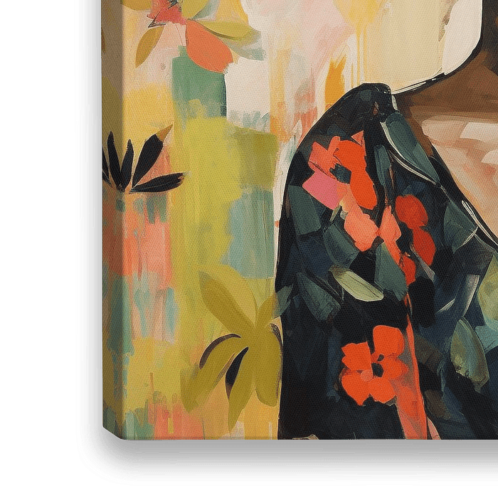 Florale Eleganz - Kräftige Pinselstriche formen ein modernes Porträt einer Frau, die einen extravaganten Hut trägt, angereichert mit floralen Motiven, die harmonisch in ihre Kleidung übergehen. Die Verwendung von leuchtenden Farben wie Orange, Gelb und Schwarz verleiht dem Bild ein modernes und frisches Aussehen, während der abstrakte…