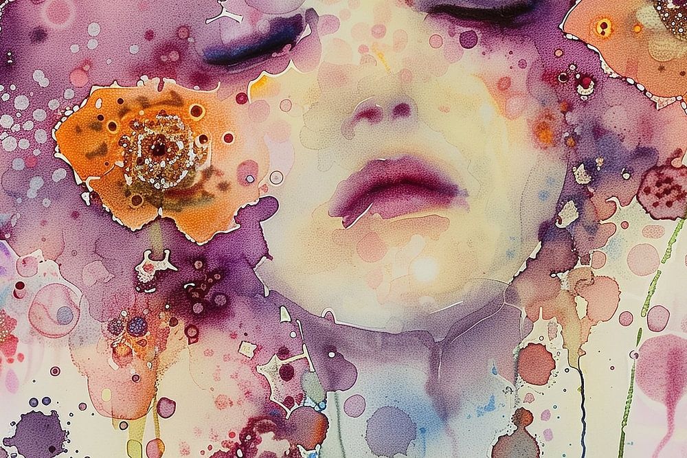 Bild eines Porträts einer Frau, verwoben mit Blumen. Das Farbschema ist lila, rosa und orange. Verträumt und phantasievoll. Passt zu verschiedenen Stilen und Trends, darunter Blumenfeld, Frauenporträt, Romantik. Künstlerin: Bianca ter Riet
