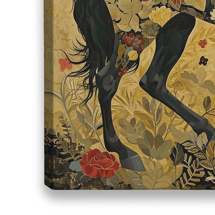 Blumenpracht - Dieses Gemälde zeigt eine künstlerische Interpretation eines Pferdes, das in einem mehrschichtigen Stil mit Blumenmotiven und organischen Elementen gemischt wurde. Der Hintergrund ist reich an goldenen Tönen, die ein luxuriöses Gefühl vermitteln, während das Pferd selbst mit einer vielfältigen Palette von Blumen in warmen…