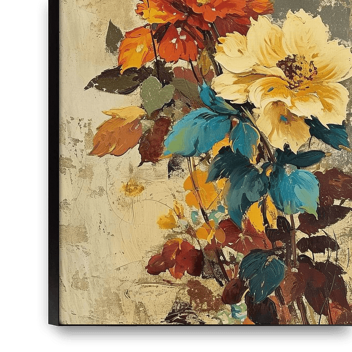 Floral Splendour - Eine lebendige Wiedergabe einer Blumenszene im impressionistischen Stil mit lockerer, ausdrucksstarker Pinselführung, die die Blumen vor einem dynamischen Hintergrund zum Leben erweckt. Die warme Farbpalette mit Orange- und Gelbtönen bildet einen schönen Kontrast zu den kühleren blauen und grünen Akzenten und sorgt…