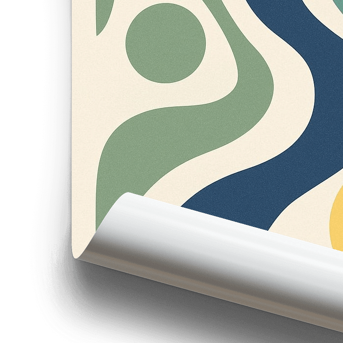 Dieses moderne, minimalistische Poster vereint fließende Formen, harmonische Farben und eine ausgewogene Komposition zu einem visuellen Erlebnis von Ruhe und Dynamik zugleich. Die sanften Linien in Blau, Grün, Gelb und Creme scheinen miteinander zu tanzen, während sie einen natürlichen Rhythmus von Bewegung und Balance erzeugen. Dieses…