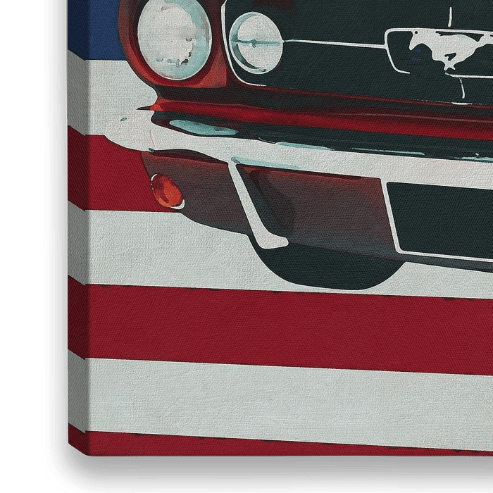 Bestelle dieses Popart-Wandbild Ford Mustang Cabriolet 1964 mit Flagge der U.S.A. von Jan Keteleer als Reproduktion auf Leinwand, Alu-Dibond, als Poster, Fototapete oder Acrylglasbild.
