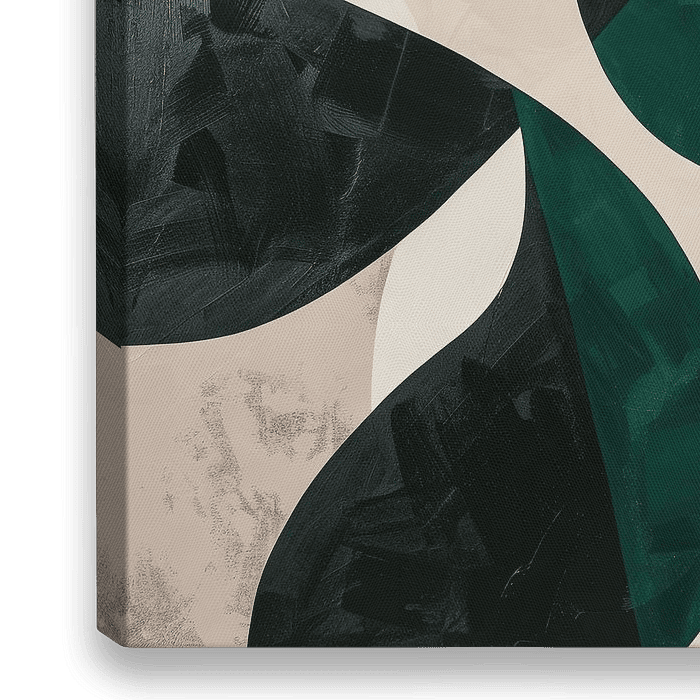 Diese Komposition setzt sich aus mehreren großen, strukturierten Formen in dunklen Grüntönen zusammen. Die Texturen und Schattierungen innerhalb der Formen verleihen dem Kunstwerk eine Tiefe und ein Gefühl von dreidimensionaler Raumwahrnehmung.