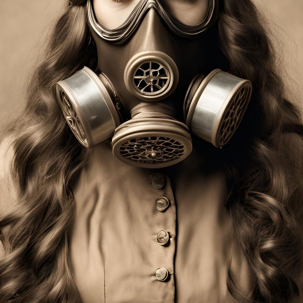 Eine historische Frauenfigur. Ihr Gesicht ist hinter einer Gasmaske verborgen und verströmt eine seltsame Mischung aus Eleganz und Verruchtheit. Die weichen Brauntöne verstärken die Nostalgie und das Gefühl einer verlorenen Zeit.