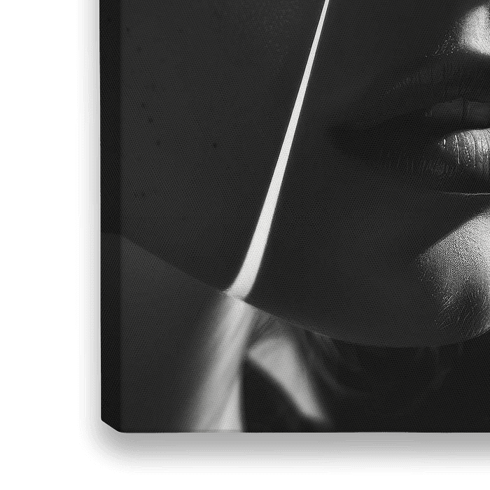Dieses faszinierende Schwarz-Weiß-Porträt spielt meisterhaft mit Licht und Schatten und hebt die starken Gesichtszüge einer Frau hervor. Die dramatischen Linien und hellen Lichtstrahlen, die über das Gesicht verlaufen, erzeugen ein kraftvolles und zugleich elegantes Bild. Ideal für Liebhaber von Schwarzweißfotografie und moderner Kunst, bringt dieses Werk eine intensive und stilvolle Atmosphäre in jeden Raum.