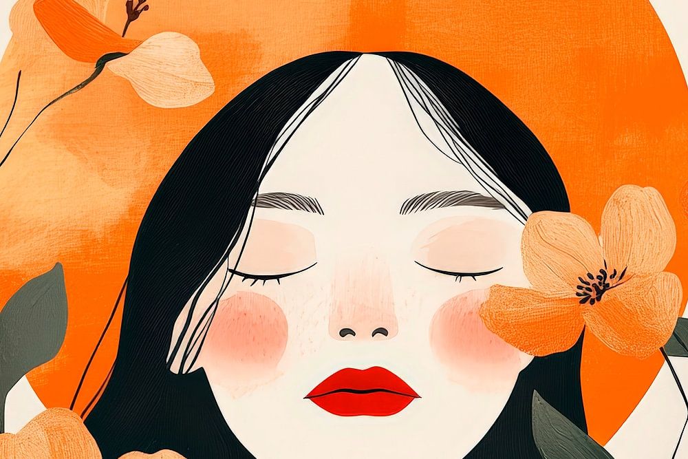 Ein harmonisches Zusammenspiel aus sanften floralen Motiven und einem strahlenden, orangenem Hintergrund vermittelt Ruhe und Lebensfreude. Die geschlossenen Augen der abgebildeten Frau strahlen Gelassenheit aus und laden dazu ein, die Gedanken schweifen zu lassen. Dieses Kunstwerk bereichert jeden Raum, besonders das Schlafzimmer, und sorgt für eine entspannende Atmosphäre.