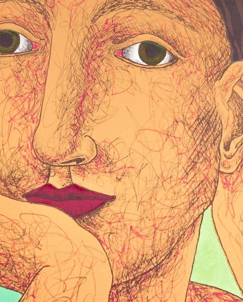 Eine farbenfrohe Lithographie einer Frau mit den Händen im Gesicht. Ein grafisches, surrealistisches Bild. Die groben Skizzenlinien und die Farben sind typisch für meine Arbeit, ebenso wie der Farbverlauf, der den Hintergrund füllt.
