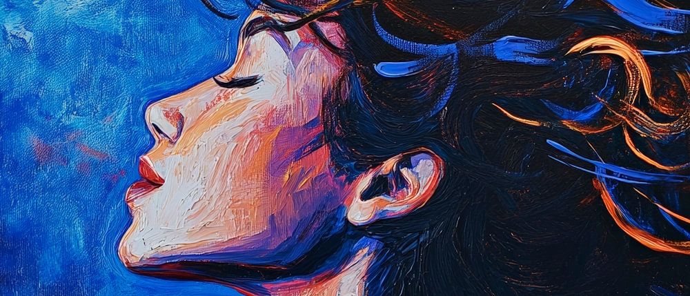 Mit lebendigen, tiefen Blau- und Rottönen entfaltet sich ein magisches Farbspektrum, das die wild wehenden Locken einer träumerischen Frau einfängt. Ihre ruhige Ausstrahlung und die dynamische Bewegung der Haare verleihen dem Raum eine harmonische Energie. Ideal geeignet für das Wohnzimmer, wo Kreativität und Inspiration fließen können.