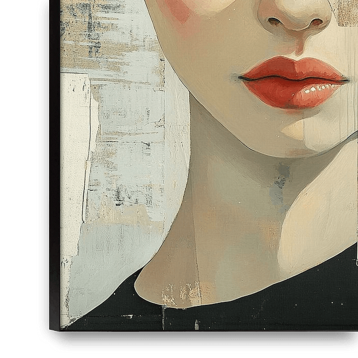 Weibliches Porträt | Blaues Auge, rotes Geheimnis - Dieses weibliche Gemälde zeigt das Porträt einer Frau mit einer Collage aus abstrakten, geometrischen Mustern, die ihr Gesicht bedecken und ihr intensives blaues Auge und ihre vollen roten Lippen hervorheben. Sie vermitteln ein starkes Gefühl von Geheimnis und…