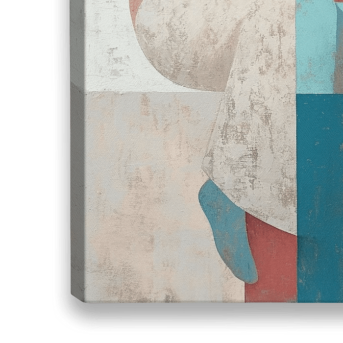 Frauenporträt | Kontemplation in Pastelltönen - Dieses Frauengemälde zeigt eine elegante weibliche Figur mit traditionellem Hut, die sitzt und ihren Kopf vor einem Hintergrund aus pastellfarbenen Quadraten in Blau und Rot ausruht.