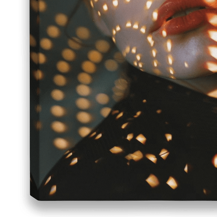 Dieses faszinierende Porträt zeigt eine Frau, deren Gesicht von bezaubernden Lichtmustern umspielt wird. Die kreative Beleuchtung erzeugt ein hypnotisches Spiel von Licht und Schatten, das die sanften Gesichtszüge und ausdrucksstarken Augen betont. Die harmonische Kombination von Lichtpunkten und weichen Konturen verleiht dem Bild eine…