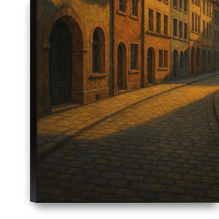 Freiburg Evening Glow zeigt eine schmale Kopfsteinpflasterstraße, die sanft in das schwindende Licht des Sonnenuntergangs getaucht ist. Im Hintergrund erhebt sich das Freiburger Münster, dessen gotischer Turm von bunten Häuserreihen eingerahmt wird, die in sanfter Wärme leuchten. Dieses von Edward Hopper inspirierte Kunstwerk verwandelt…