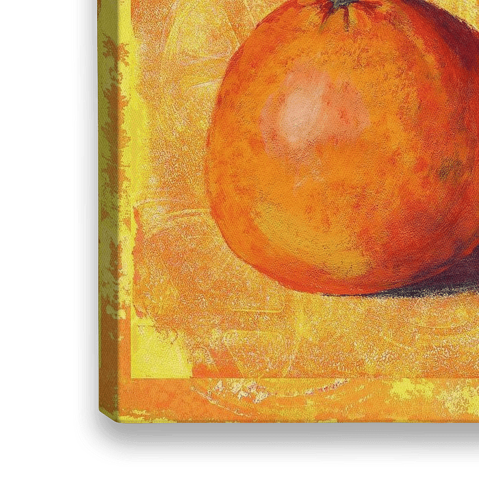 Eine einzelne frische saftige Orange und eine einzelne frische saftige Zitrone träumen davon, leckere Limonade zu werden. Die Orange und die Zitrone sind realistisch gemalt in frischem, leuchtenden Orange, Gelb und Grün. Der Hintergrund in Gelb- und Orangetönen ist abstrahiert und man kann Orangen- und Zitronenscheiben erkennen. Der spielerische Einsatz von Farben und die Wiederholung von Zitrusquerschnitten sorgen für ein lebendiges und erfrischendes visuelles Erlebnis - ein sommerliches Gemälde voller Licht, Energie und leuchtenden frischen Farben.