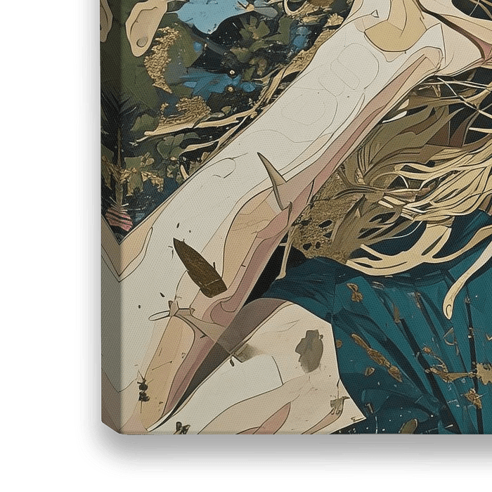 Joy - Dynamik und Freude versprühen dieses Porträt, in dem eine Figur in einem Moment unbändiger Freude ihr Haar vor einem Hintergrund voller abstrakter Blumenformen locker hin und her wirft. Die Kombination aus Goldspritzern und leuchtenden Blautönen verleiht der Szene eine fast festliche Ausstrahlung, während die lockeren…
