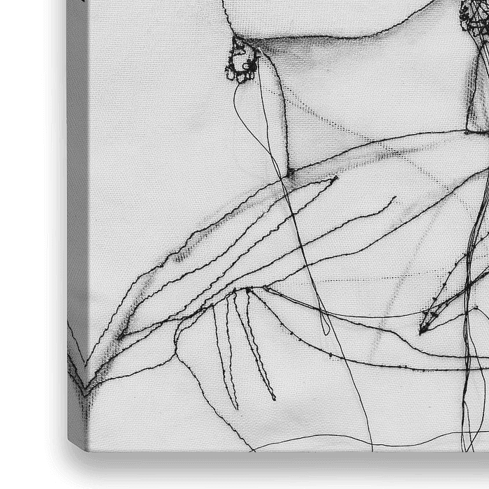 Frida, ein minimalistisches Werk aus schwarzem Draht auf Leinwand. Ich habe mich dafür entschieden, sie ohne Schnurrbart, Monograuw und Blumen darzustellen. Denn die fröhlichen Farben und Blumen kontrastieren mit ihrer Einsamkeit & Angst.