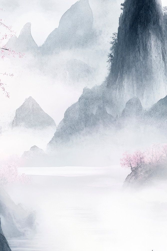 Faszination der Natur in sanften Grautönen: Majestätische Berge umhüllt von mystischem Nebel, während zarte Kirschblüten das Bild veredeln. Zwei Gestalten rudern ruhig über den spiegelglatten See, begleitet von fliegenden Vögeln. Diese harmonische Komposition bringt Frieden und Gelassenheit – perfekt für das Schlafzimmer oder einen ruhigen Rückzugsort im Wohnzimmer.