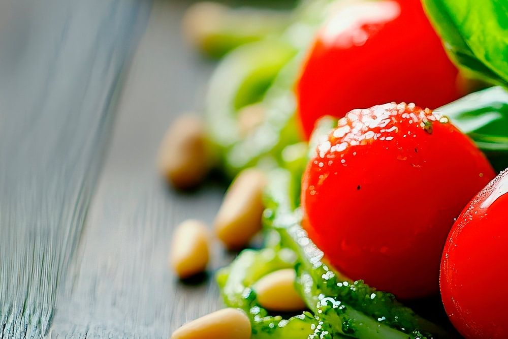 Ein verleitet zum Schlemmen: Saftige, rote Tomaten liegen auf einem Bett aus frischem Basilikum und zarten Pinienkernen. Das harmonische Zusammenspiel der leuchtenden Farben und die rustikale Holzunterlage schaffen eine einladende Atmosphäre. Perfekt für die Küche, bringt dieses Bild das Lebensgefühl von mediterraner Frische und Genuss direkt nach Hause.