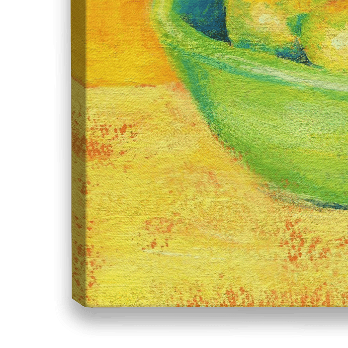 Frische Zitronen in einer grünen Schüssel ist ein Acrylgemälde im zeitgenössischen quadratischen Format gemalt von der Künstlerin Karen Kaspar. Eine grüne Schüssel gefüllt mit frischen saftigen gelben Zitronen steht auf einem Tisch. Der Hintergrund des Stilllebens ist abstrakt in Gelb- und Orangetönen gemalt. Das Bild ist in einem spontanen lockeren Stil gemalt in leuchtenden frischen Farbtönen von sonnigem Gelb, frischem Grün, Blau und Orange. Es eignet sich perfekt zur Dekoration von Wänden in Küche, Esszimmer oder einem Restaurant.