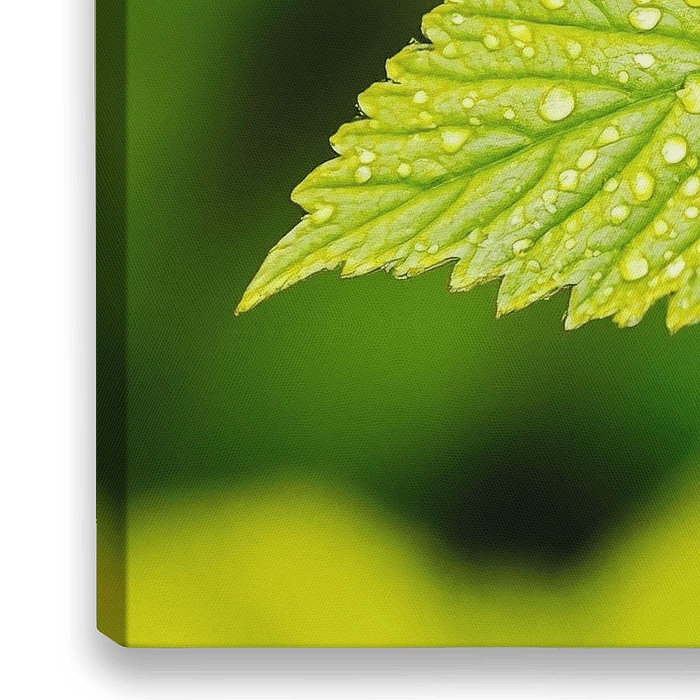 Frisches Grün sprießt hervor, die Tropfen der Morgenrührung gleiten sanft über die lebendigen Blätter. Diese Detailaufnahme strahlt eine beruhigende Natürlichkeit aus, die die Sinne belebt. Perfekt geeignet für ein Wohnzimmer oder eine Küche, wo sie ein Gefühl von Vitalität und Frische vermittelt. Ein harmonisches Element, das jeden…