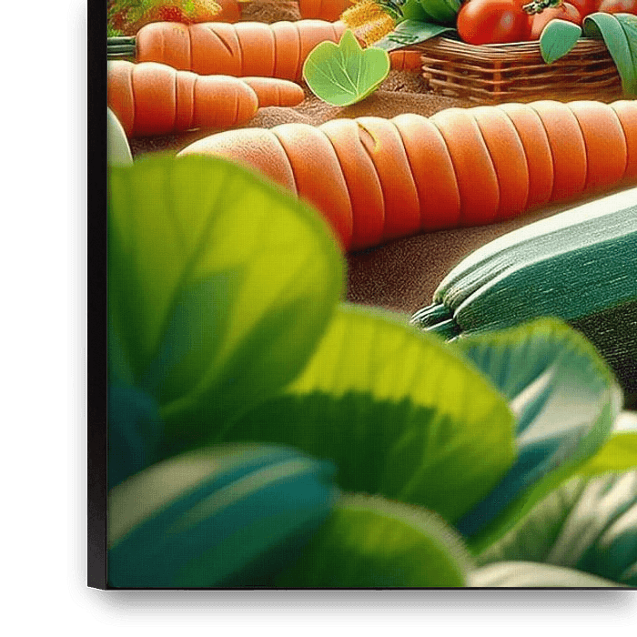 Bestelle das digitale Kunst Bild Fröhlicher Marienkäfer erkundet den bunten Gemüsegarten von artefacti als Reproduktion auf Leinwand, Alu-Dibond, als Poster, Fototapete oder Acrylglasbild.