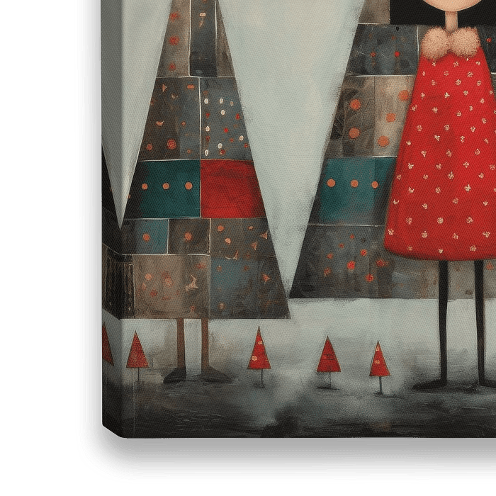 Frohe Weihnachten. Eine fröhliche Illustration eines Mädchens, umgeben von Weihnachtsbäumen. Illustration. Wählen Sie das Material und die Größe, auf die Sie dieses Werk drucken möchten, und passen Sie es an Ihre Einrichtung an.
