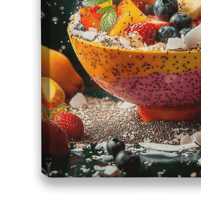 Eine burstende Farbenvielfalt aus frischen Früchten, die aus einer kunstvollen Schüssel herauszuwirken scheint, erweckt den Appetit auf gesunde Genüsse. Die Kombination aus Banane, Erdbeeren und Blaubeeren, umhüllt von Kokosflocken, vermittelt ein Gefühl von Freude und Frische. Perfekt für die Küche, um eine einladende und lebendige…
