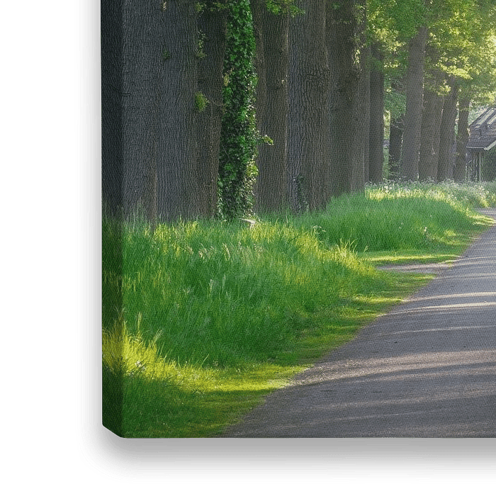 Frühling in Landgoed Ampsen. Die Baumallee hat einen schönen Grünton und das warme Morgenlicht rundet das Bild ab.