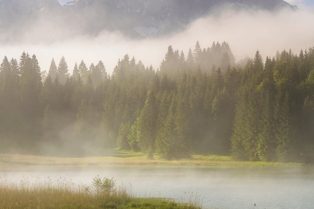Die Sonne löst langsam den Nebel auf und endlich wird der Blick auf das Karwendelgebirge und den See freigegeben.