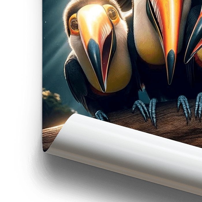 Dieses farbenfrohe Poster zeigt eine Gruppe fröhlicher Tukane, die scheinbar neugierig und voller Lebensfreude in die Kamera blicken. Die Szene ist in warmes Sonnenlicht getaucht, das durch die Blätter des tropischen Regenwaldes dringt und den exotischen Vögeln eine magische Ausstrahlung verleiht. Die detailgetreue Darstellung der Tukane mit ihren leuchtend orangen, gelben und schwarzen Schnäbeln verleiht dem Bild eine unglaubliche Dynamik.