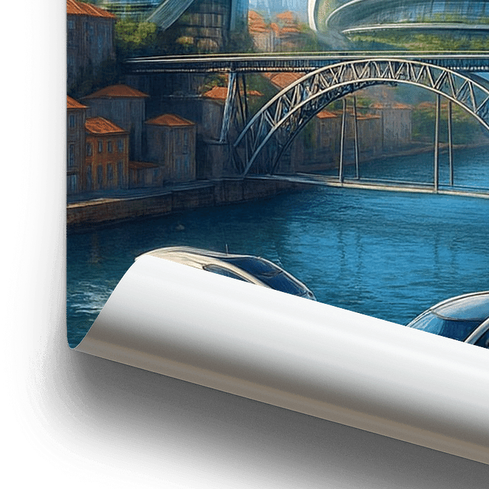Dieses beeindruckende digitale Poster zeigt eine visionäre Zukunftsversion der portugiesischen Stadt Porto – ein harmonisches Zusammenspiel aus historischen Altstadtfassaden, ikonischen Brücken und atemberaubend futuristischer Architektur. Das Bild verbindet das warme, mediterrane Flair der traditionellen Häuser mit ultramodernen,…