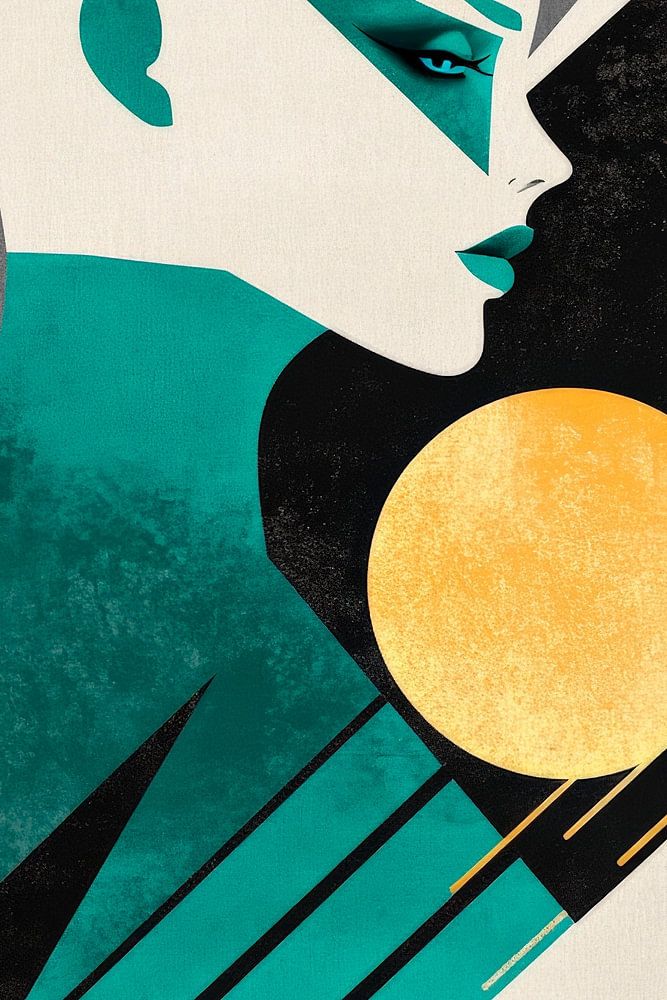 Eine faszinierende Silhouette, die durch kühne Farben und klare Linien besticht, zieht den Blick an und vermittelt modernistische Eleganz. Die stilisierte Darstellung wird von einem leuchtenden, goldenen Akzent ergänzt, der Wärme und Tiefe hinzufügt. Ideal für ein Wohnzimmer oder ein kreatives Büro, um eine inspirierende Atmosphäre zu schaffen.
