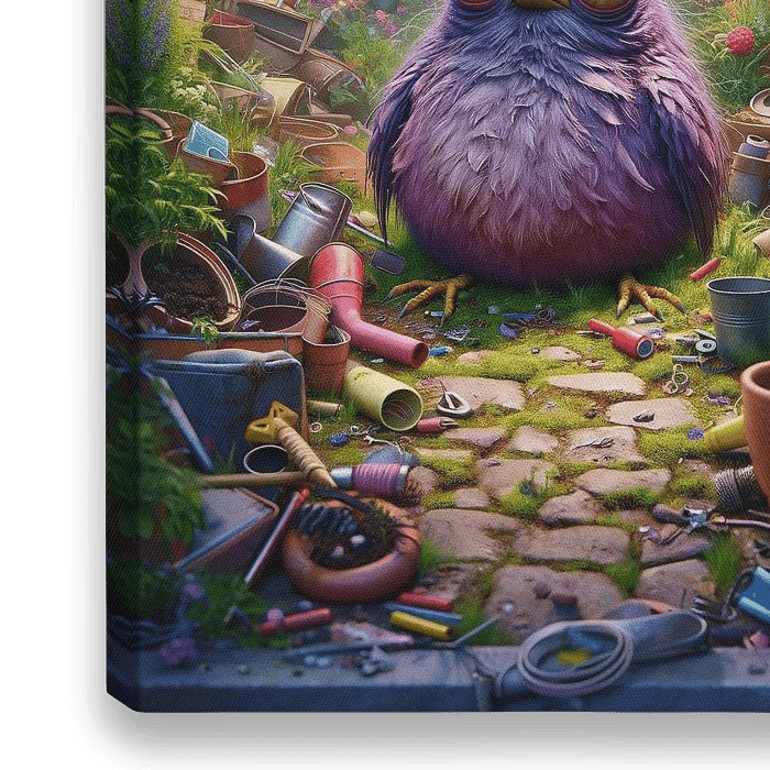 Inmitten eines überwucherten Gartens, umrahmt von einem üppigen Blumenmeer und diversen Gartengeräten, thront ein plüschiger lila Vogel mit übergroßen Augen, der uns mit einem leicht verwirrten Blick begegnet. Die dichte Vegetation verbirgt ein kleines Chaos aus verstreuten Töpfen, Werkzeugen und Gartenschläuchen, das sich charmant in…