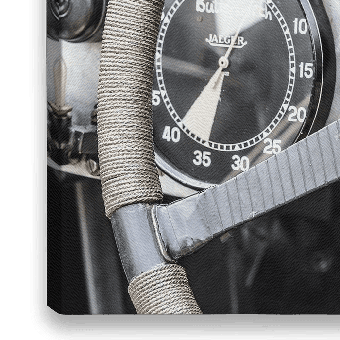 Gebürstetes Bentley-Armaturenbrett aus Aluminium der 1920er-Jahre mit Tachometer in einem englischen Oldtimer von Bentley im britischen Renngrün auf einer Automobilausstellung.