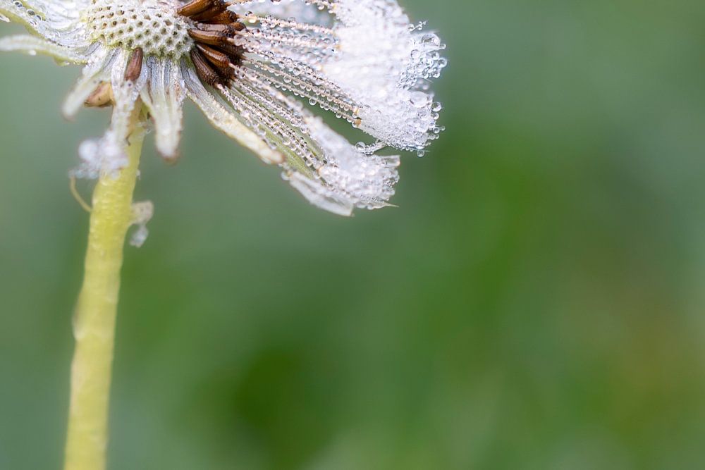 Dieser Löwenzahn ist buchstäblich in den Tau eines frühen Herbstmorgens getaucht und in ein Meer von Tautropfen gehüllt. Die feinen, silbrigen Perlen der Feuchtigkeit glitzern auf dem Flaum der Pflanze.