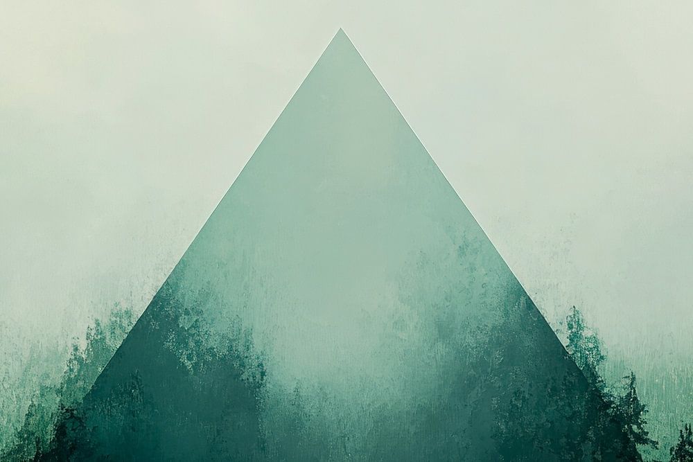 Ein geheimnisvoller Pyramidenspitze ragt majestätisch aus einem Nebelmeer hervor, umgeben von dunklen, geheimnisvollen Wäldern. Die harmonische Verbindung von Mystik und Natur schafft eine beruhigende Atmosphäre, die perfekt ins Schlafzimmer passt, um eine entspannte Stimmung zu fördern und die Gedanken zur Ruhe kommen zu lassen.
