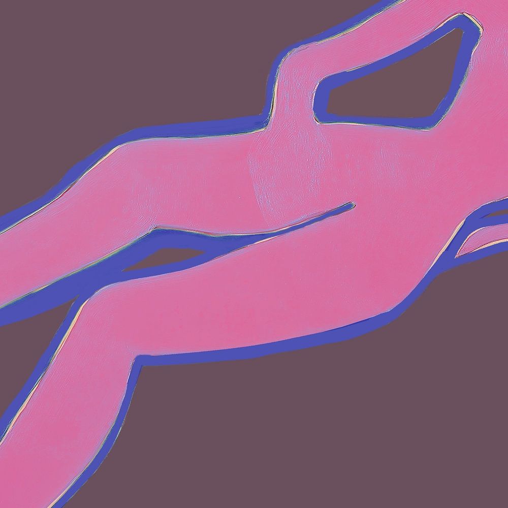 Auf diesem Gemälde liegt eine Frau friedlich auf der Seite, ihr Körper wird von einem engen, rosafarbenen Catsuit umhüllt, der nahtlos über ihre Formen fließt, einschließlich passender rosafarbener Schuhe, die sie harmonisch mit dem Hintergrund verbinden. Das Rosa ihres Outfits wird kraftvoll von einer grünen Linie umrahmt, die ihren Körper akzentuiert, als ob die Natur selbst sie formt und stützt, und das Gleichgewicht der Farbtöne schafft eine subtile, aber deutliche visuelle Harmonie.